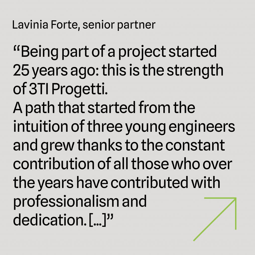 “Being part of a project started 25 years ago: this is the strength of 3TI Progetti. A path that started from the intuition of three young engineers and grew thanks to the constant contribution of all those who, over the years, have contributed with professionalism and dedication. That small design studio, born 25 years ago in a flat in Rome, thanks to the work of all those experts who have provided ideas and skills has become today an employee-owned engineering company operating in the most important national and international markets of the sector. ‘A successful company is the sum of each individual success’.”
