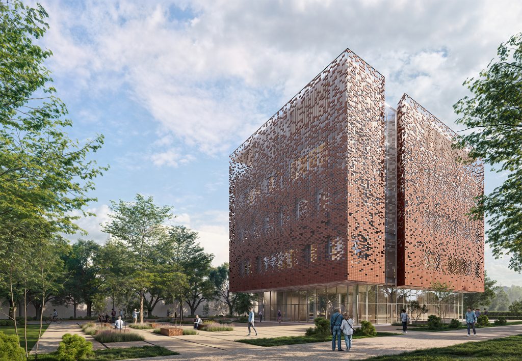 The building features a compact, monolithic volume with a diagonal cut that acts as both a symbolic gesture and a spatial device, shaping light, internal organization, and visual connections with the surrounding neighborhood. Its façade reinterprets local building traditions through a ceramic brise-soleil system, combining architectural identity, solar control, and indoor comfort.