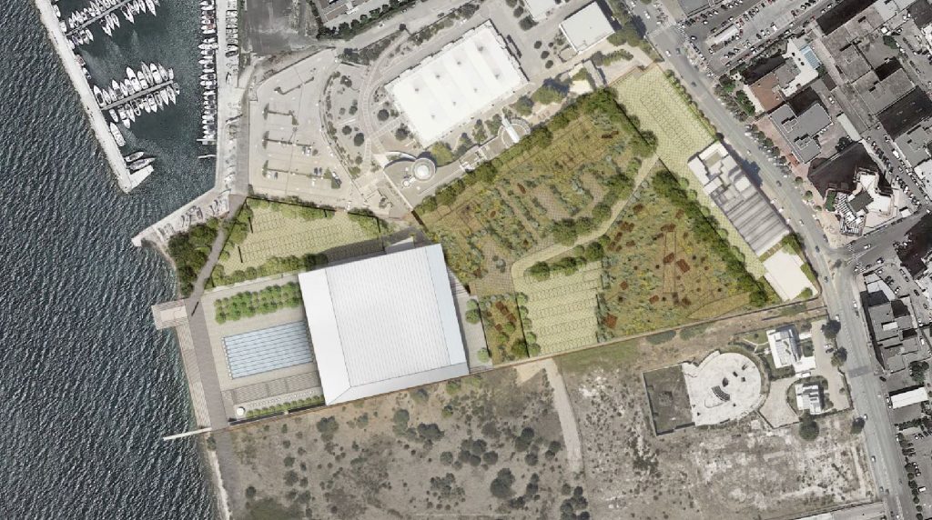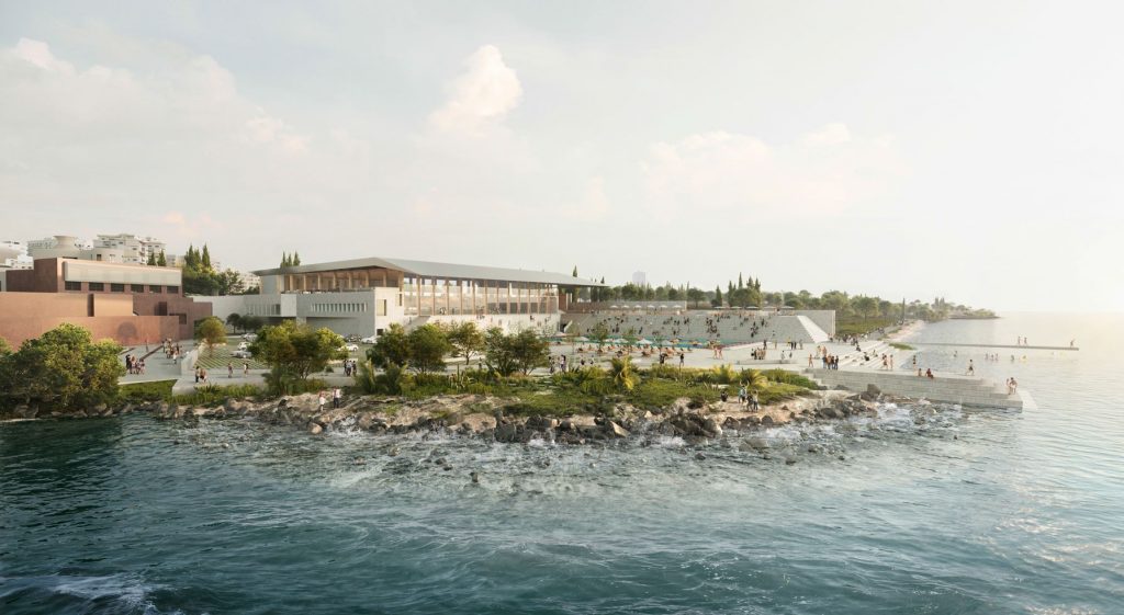 The project is configured as a landscape intervention characterized by a ‘minimal façade shell’ necessary to create the microclimate for the indoor pool areas; while the stairs, ramps and terraces provide a spatial conformation where people are free to move around and which connects the city to the Archaeological Park and finally to the waterfront.